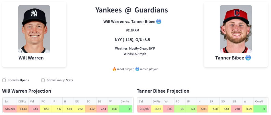 Tanner Bibee has just a 17% K% early on this year with a 12.6% BB%. That’s a very slow start. I would expect him to improve, but this is obviously a tough matchup against the Yanks.