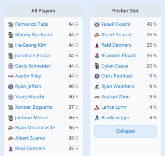 Detmers: Tough matchup and a guy that hasn’t been reliable in the past. But his numbers are elite this year. The projected ownership is about half of Cease. Tough call but I think I’m willing to take a good amount of him tonight.
