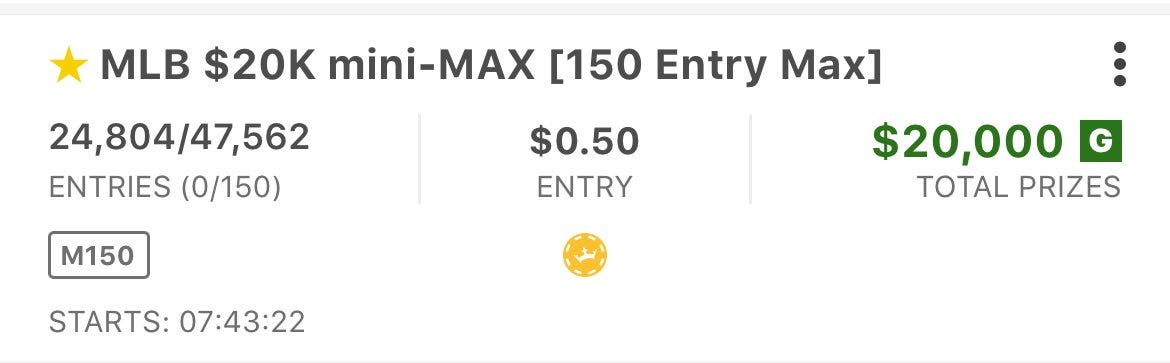 Cease: Top projected ownership pitcher in Coors. This smells like someone I want very little of here if I’m gunning for first place. Cease is over-performing, is always susceptible to the bad outing, in Coors, and just a generally good pitcher to fade when other people are on him. I’m going max 10% exposure for now.