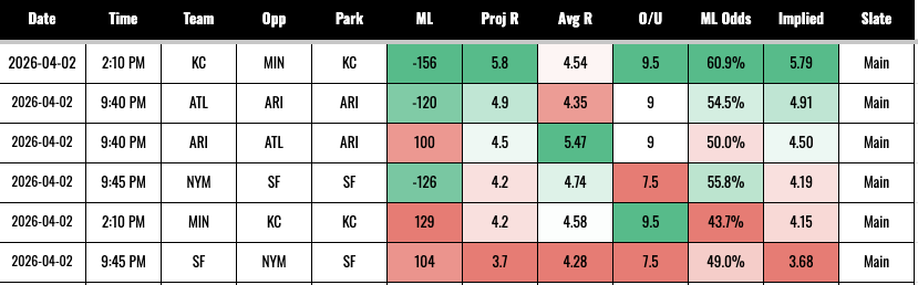 My projected run total agrees with the sports book implication. I have the Royals are 5.8 runs to lead the slate by far.
