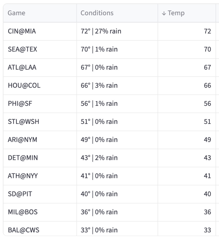 It’s cold today. Six games with forecasted temps under 50. Should be a good day to be a pitcher in those spots.