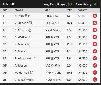 I’m not going to write up anybody else, but from the research I just did, I think Eflin + Darvish is the cash play. So that’s what I’m going to start with.
