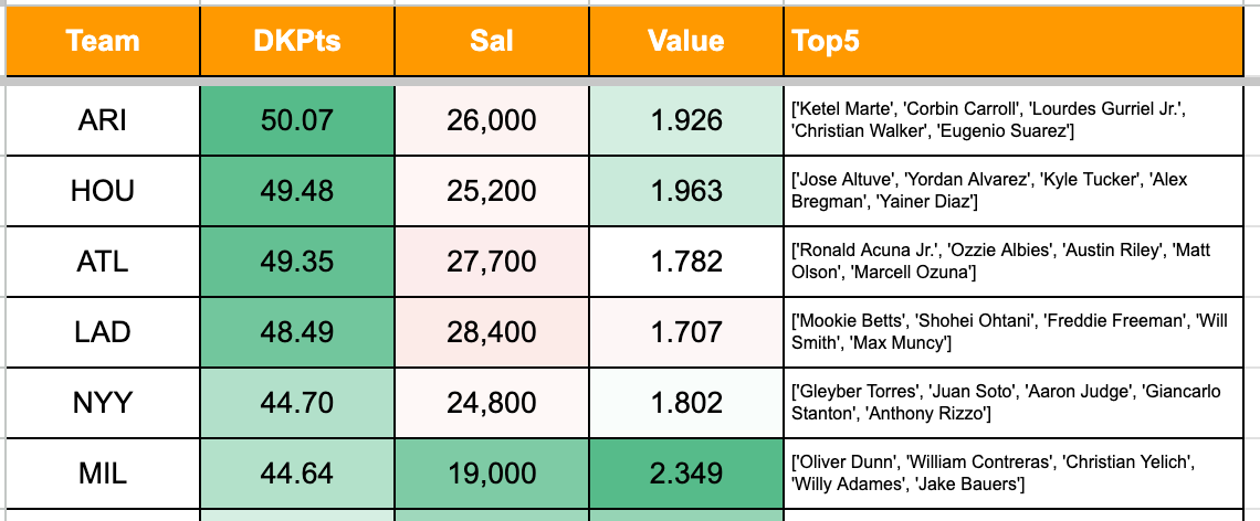 The model really likes Michael Harris II and Chas McCormick for the price as well. They’re both under $4,500. I’m hesitant to play Lourdes Gurriel at that price, I know he’s got a few homers already but he’s really not a great power hitter and he won’t steal any bases, so I’d rather leave him off the lineup.
