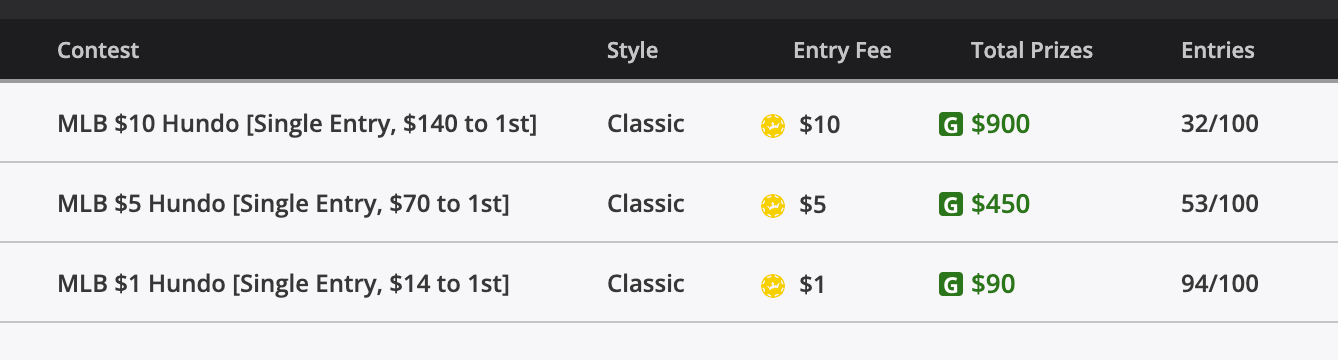 What I am going to do tonight is roll with one lineup in three contests. Our league contest, of course (click here to join the league!), a $25 double up, and one of these “Hundo” contests. These Hundo’s are great because they are just 10% rake.