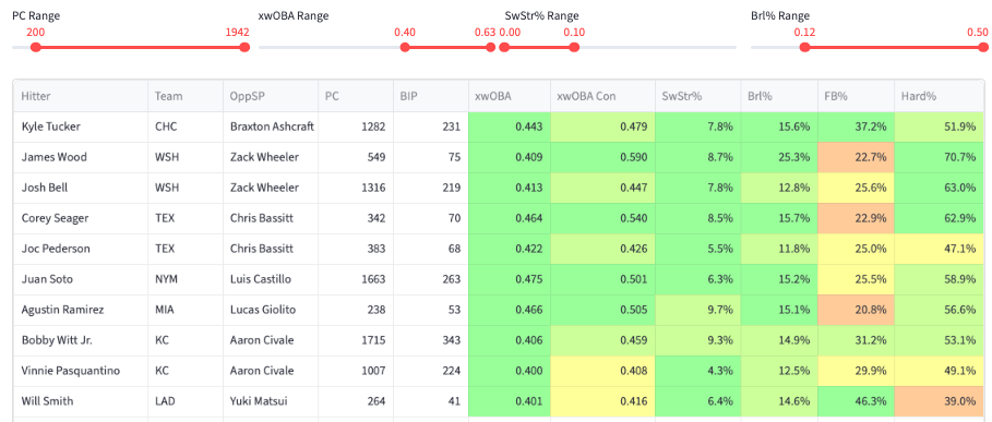 Our boy Agustin shows up as a BOOM hitter. In fact, you could call him a super boom hitter if you want. When we filter to at least a .400 xwOBA with a 12%+ Brl% and a sub-10% SwStr%, he shows up along with these other hitters.
