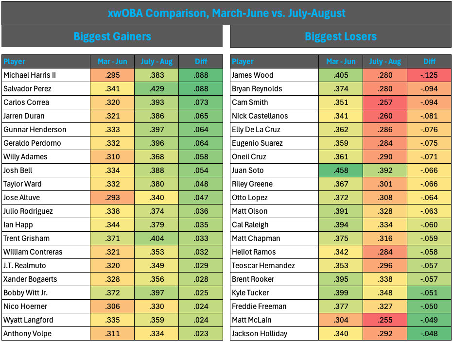 Here’s a little table of xwOBA I shared on X. I took March through June data and compared with July through August to see which hitters have improved and declined the most.