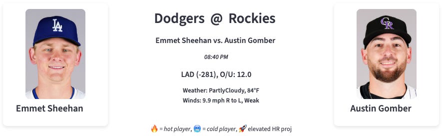 What do we have with Emmet Sheehan? The Dodgers are trying to figure that out. I don’t think you’ll get great information from a Coors start tonight. Sheehan has a non-awful fastball with an 11.5% SwStr% on 48% usage. But he doesn’t throw it for strikes nearly enough, at a 45% Strike%. The slider is the strikeout pitch for him, and the thin air will take some sharpness off of that.