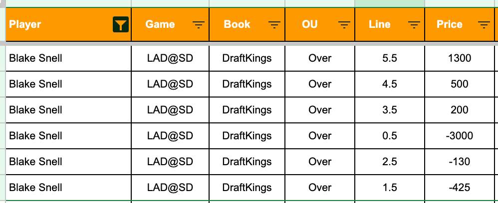 But those all seem super fair. Nobody ever thinks Snell won’t walk guys. It’s not about that. What we want to bet on when hoping for a hiccup would be a really short outing. Except these friggin’ books don’t even let you bet unders hardly at all anymore because they’re all snakes.