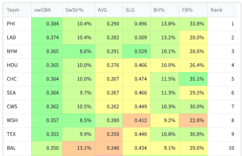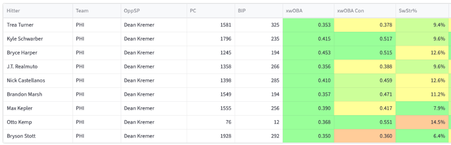 The Phillies lineup is thriving right now. Since June 15th, they lead the league with a .012 xwOBA OE. Only Toronto and the Cubs join them above 0.010 here. They are cruising, and they get another game against the very weak Orioles pitching staff. Dean Kremer will start this one, and that’s a particularly favorable matchup for these Phillies bats, as you can see there by the Phillies being the #1 offense in the matchups model tonight.