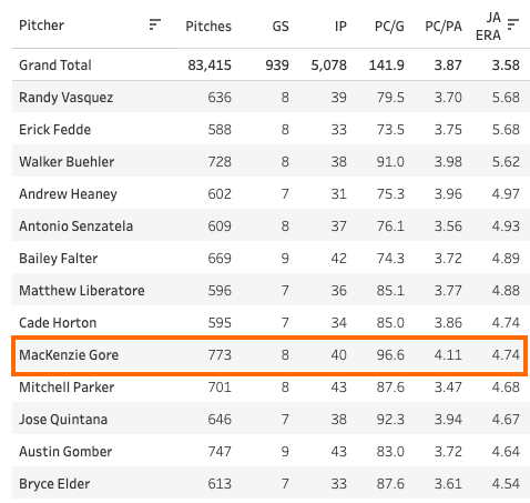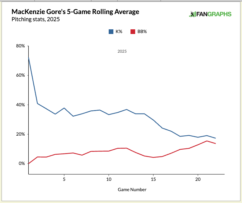 This game is in DC, so the A’s don’t get that comfy home ballpark advantage. They’re not a very good lineup on the road (.759 OPS at home, .723 on road), but MacKenzie Gore is busted right now.