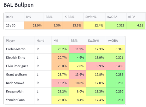 It’s not only a good matchup against the starting pitcher, but this Orioles bullpen is also currently one of the worst units in the league. They rank #25 of 30 clubs in my model tonight.