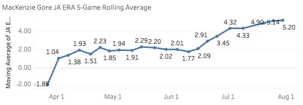 Things really started to fall apart around June 15th. Since then, his 4.74 JA ERA is 9th-worst in the league.