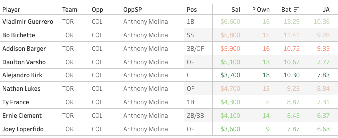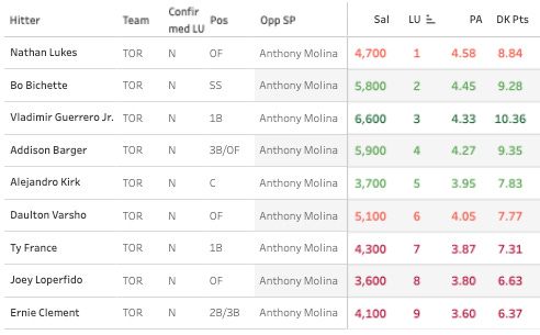 My model is probably too low on them. The Bat X has Vlad for 13.3 points tonight.