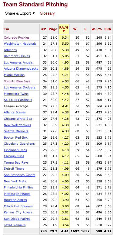 The Rockies pitching staff is truly something historic. They are allowing 6.34 runs per game. Nobody else is above 5.5. It is completely nuts.