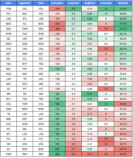 That’s right, the Toronto Blue Jays are implied for 8.5 runs tonight. That might be the line you get right from the sports book, but that’s the calculation by taking that 12 O/U and splitting it among the two teams based on the moneyline, which suggests the Blue Jays would win this game seven out of ten times.