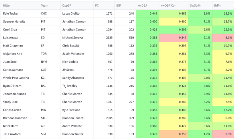 The nice values here would be Spencer Horwitz and Oneil Cruz, as well as Jack Suwinski. Cannon has given up a .346 xwOBA to lefties since last year. He has a 4.28 JA ERA this year, and his strikeout rates are well below 20%. The Pirates are in a good spot to score some runs here.