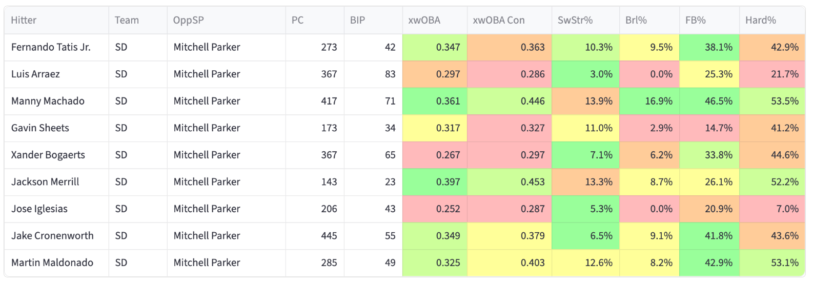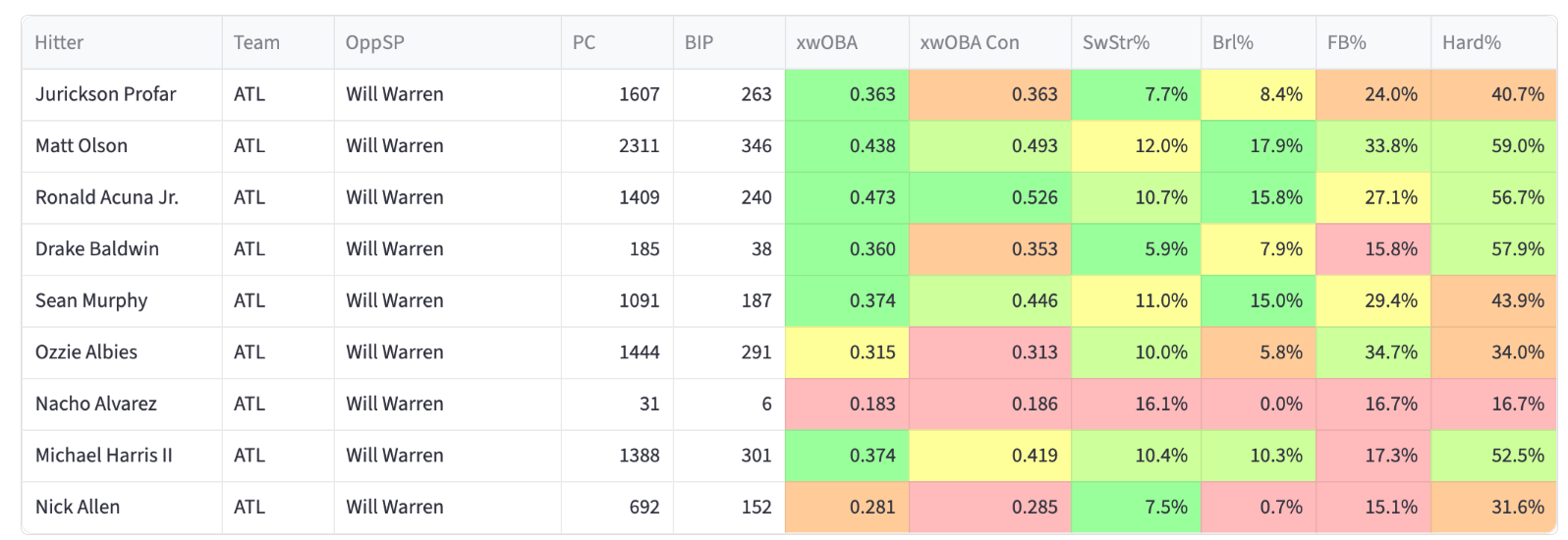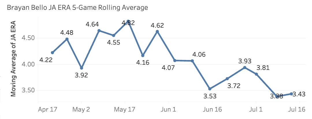 He is up to a 15.6% K-BB% with a .279 xwOBA allowed and a 50% GB% over his last five starts. But it’s still a pretty mediocre 3.40 JA ERA over that time, and he’s been the beneficiary of some very good luck (.221 BABIP and a 14.8% RISP H%. Click that link to go to an X thread where I explain what that is. So I think Bello is in for a tough outing tonight.