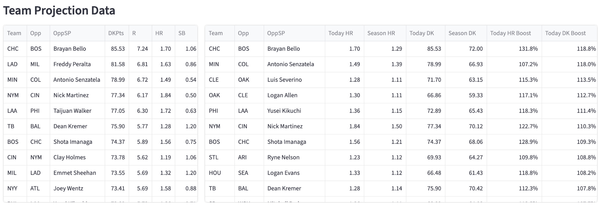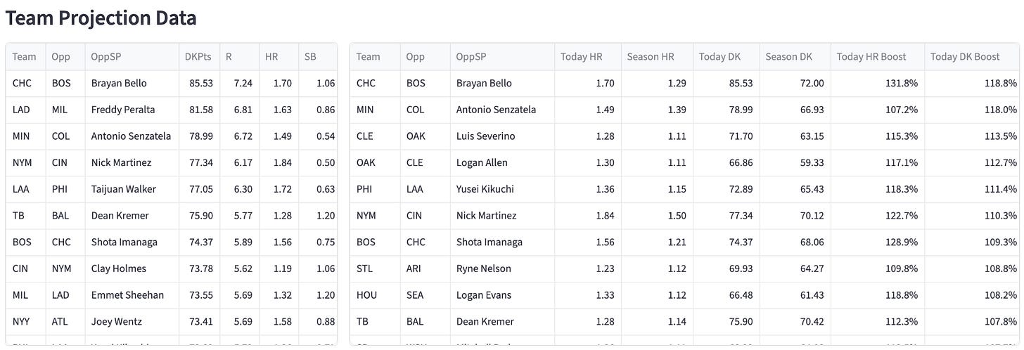 The model absolutely loves picking on Bello. So the Cubs are the top projected offense on the board, and they’re also the top projected offense above season average.