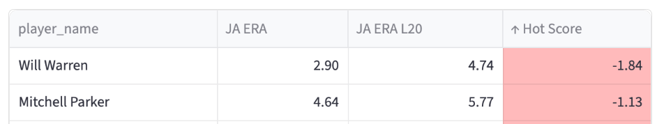 I built out that player trends page on the slate analysis app over the break. We can see which pitchers are in much better or worse form in over the last three weeks.