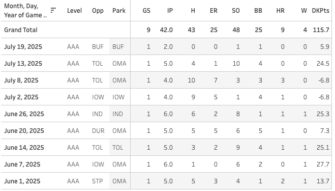 This year, he’s posted a 5.36 ERA and a 1.62 WHIP in AAA, but hey, he does sport a 25% K%! He’s just been wild (13% BB%) and has given up a ton of dingers (1.9 HR/9).