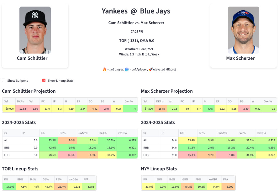 The Blue Jays are by far the toughest lineup to strike out. And there’s a fair question about how many pitches Schlittler will throw here. He’s a young, unproven arm, and now it’s been two weeks since he’s been in a real game. I could see him going like 65 pitches.