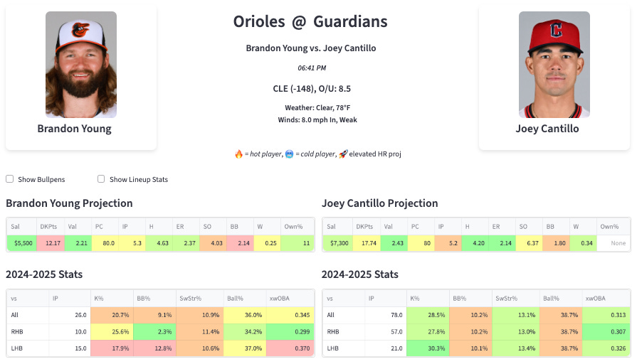 There is plenty of strikeout in the Orioles lineup (Mayo 33%, O’Neil 32%, Cowser 31%, Laureano 29%, Holliday 27%, Stallings 26%). So I think Cantillo has a good chance to be a positive in the fantasy game tonight. I’m not saying he’s going to cruise through six innings or anything like that, but I could see five innings with eight strikeouts.