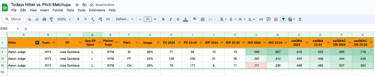 He faces Jose Quintana tonight. Quintana throws sinkers, four-seamers, and changeups, and he’s left-handed. So we look back to 2023 to see when Judge has faced left-handed sinkers, four-seamers, and changeups. Then we look up his ISO, xwOBA, and xwOBACON against those pitches. And those are the numbers you’ll see there. So Quintana throws a sinker 26% of the time, and Judge has a .412 ISO against left-handed sinkers dating back to last year on 38 balls in play.