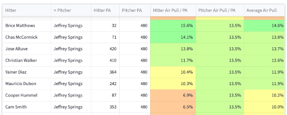 Absolutely loving these guys. Cam Smith, Christian Walker, Chas McCormick, and Brice Matthews look like the guys most likely to get a ball up in the air and into those Crawford Boxes tonight. The best Astros are pulling balls in the air: