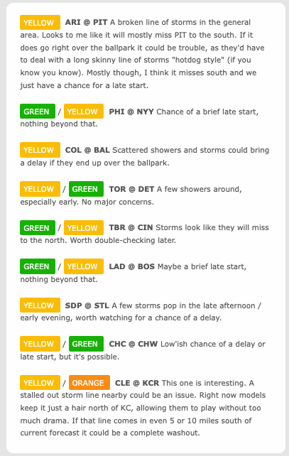 Welcome to another Friday night of baseball. We have quite a bit of rain across the great United States tonight, so that’s something we’ll have to keep in mind. Here’s the rundown from Kevin Roth over at RotoGrinders.
