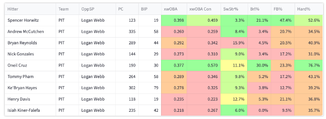 It’s another spot where you might not pile up strikeouts, but there’s a ton of red in that xwOBA column. Runs mostly come from extra base hits, and I don’t think the Pirates will getting many extra base hits tonight. I like Webb to get deep into this game and limit runs.