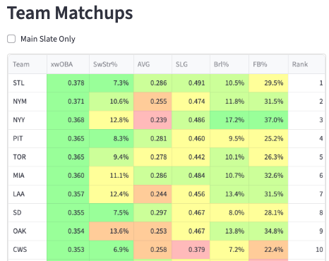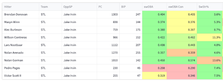 St. Louis tops the matchup model team rankings tonight in this spot against the very hittable Jake Irvin.