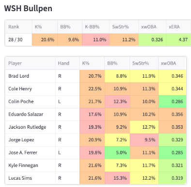 Great spot for St. Louis just looking at the SP matchup. It gets even better when you look behind Irvin to the Washington bullpen, which ranks #28 of 30 teams playing tonight in my model.