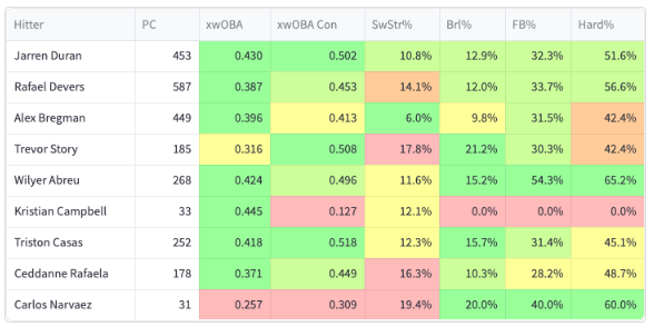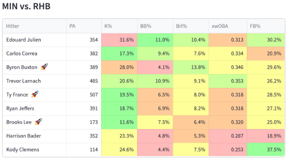 Brayan Bello on the other side is not a good Major League pitcher. He has a 21% K% and a .334 xwOBA allowed since last season. He does handle righties pretty well (.304 xwOBA), so the Twins lefties would be the better bats to target.