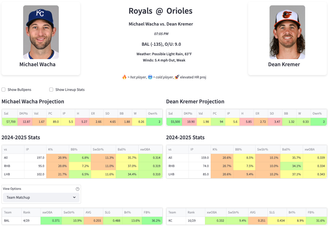 Neither Michael Wacha nor Dean Kremer is a strong DFS play. They both have strikeout rates around 20%. At the same time, they usually aren’t getting smoked out there. Wacha especially limits hard contact (.314 xwOBA). Kremer is a bit worse than that, but it’s nothing terrible at a .339 xwOBA. The Royals are also not the most successful offense going right now, although the best matchups model does like them as a unit, ranking them #4 on the board tonight. If there’s any truth to that, then there’s value in betting on the Royals in one way or another. But I can’t really get behind playing them on DFS as a team stack.