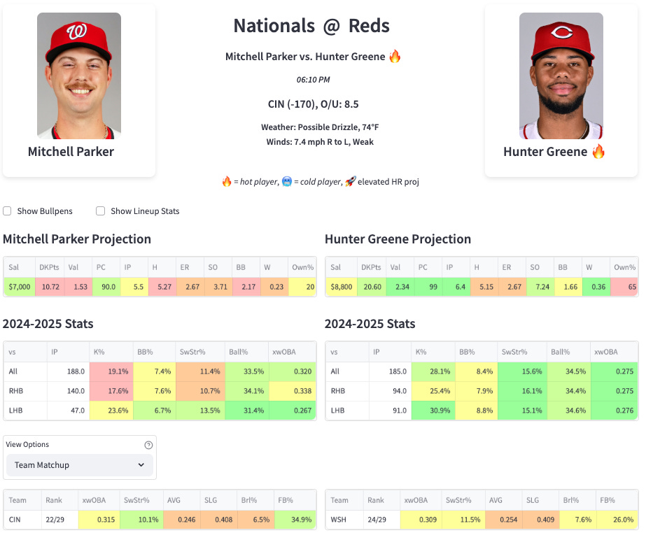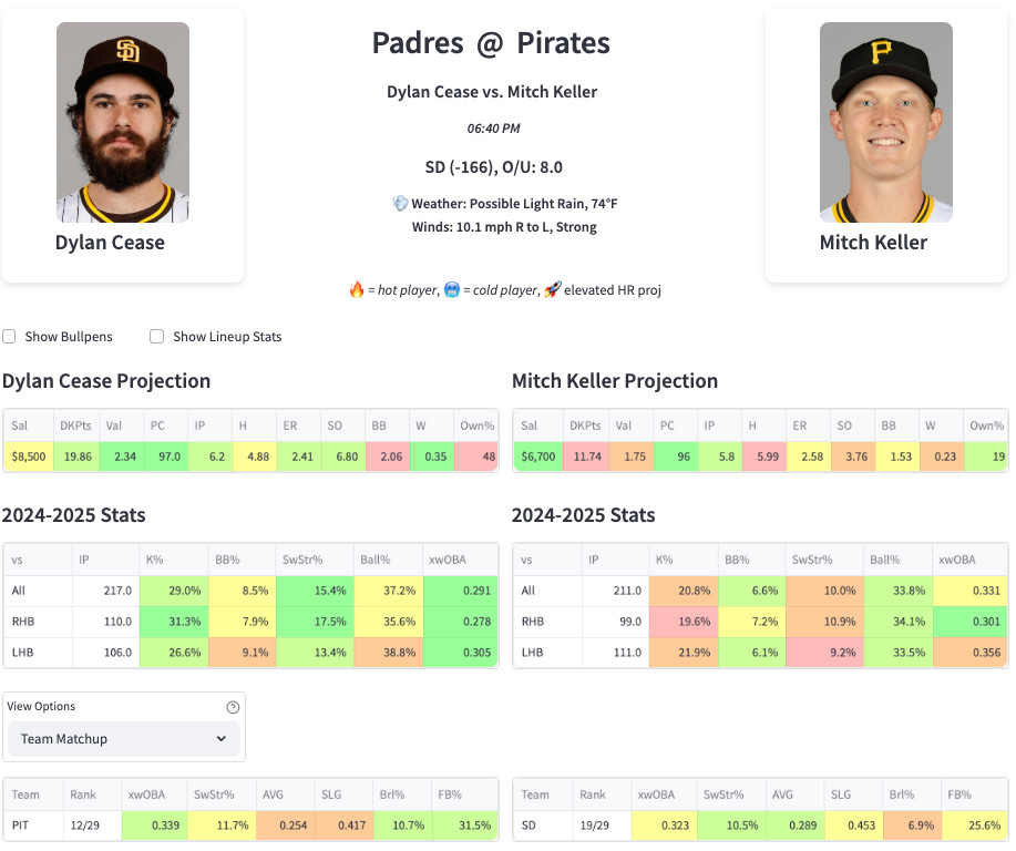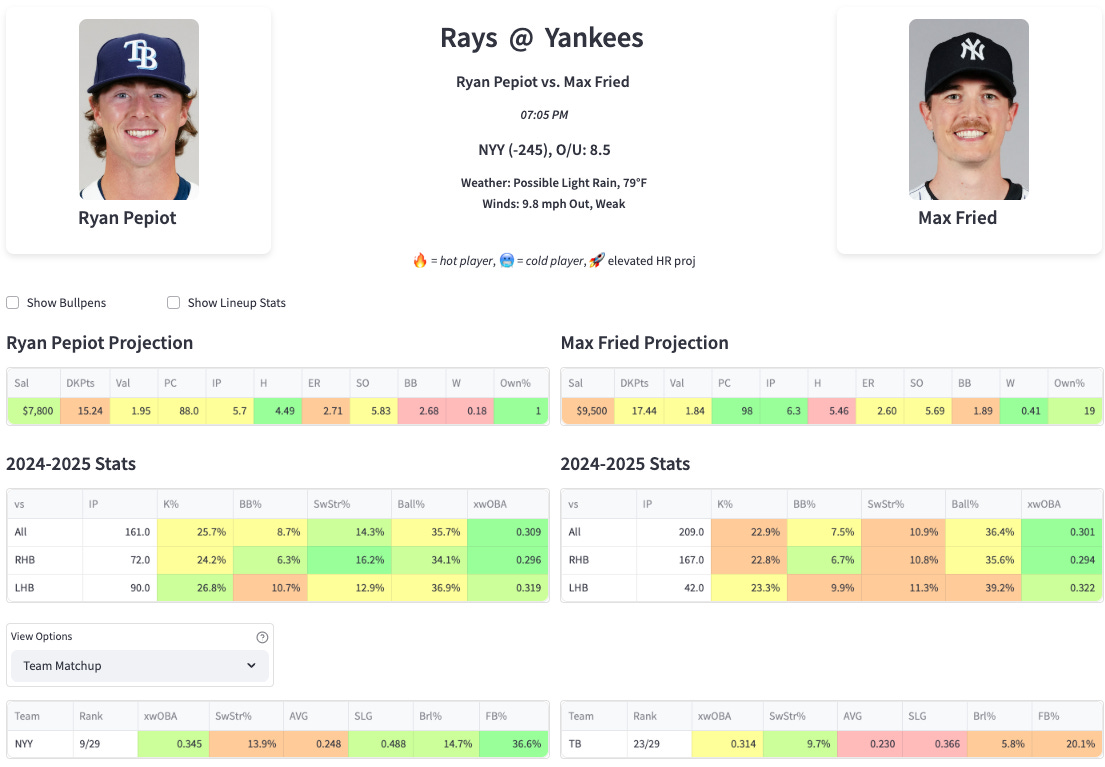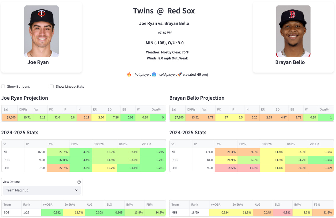 The main projection model, which doesn’t consider this super-granular matchup stuff, likes Joe Ryan ($9,000). But he’s a fly-ball heavy pitcher against a lineup that can hit righties pretty hard. So I think I’ll fade him. And maybe that does push me into a mini Red Sox stack, since it’s not going to be highly owned. If the advanced model is right, we could get an edge here.