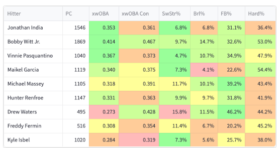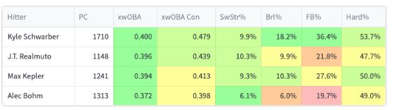 It’s also a pretty fantastic spot for Kyle Schwarber. He’s on the BOOM hitters list with a .400 xwOBA and a 9.9% SwStr% against righties like Kelly. We also show Realmuto, Kepler, and Bohm showing up there.