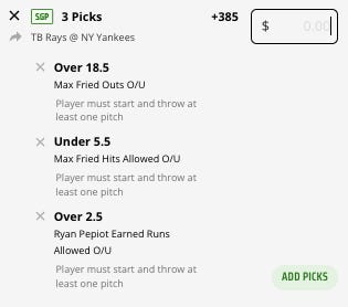 Let’s just continue to build out some for-fun same game parlays to play the angles. I never feel great about Fried limiting runs since he allows balls in play, but I do like his chances of getting deep into the game since the Rays don’t walk much and they don’t figure to hit multiple homers here. We’re hoping for a decent BABIP night for Fried. Let’s focus on both pitchers here. We’ll go with Fried limiting hits and getting deep into the game, and then take the angle of the Yankees getting a couple of balls into the seats against Pepiot.