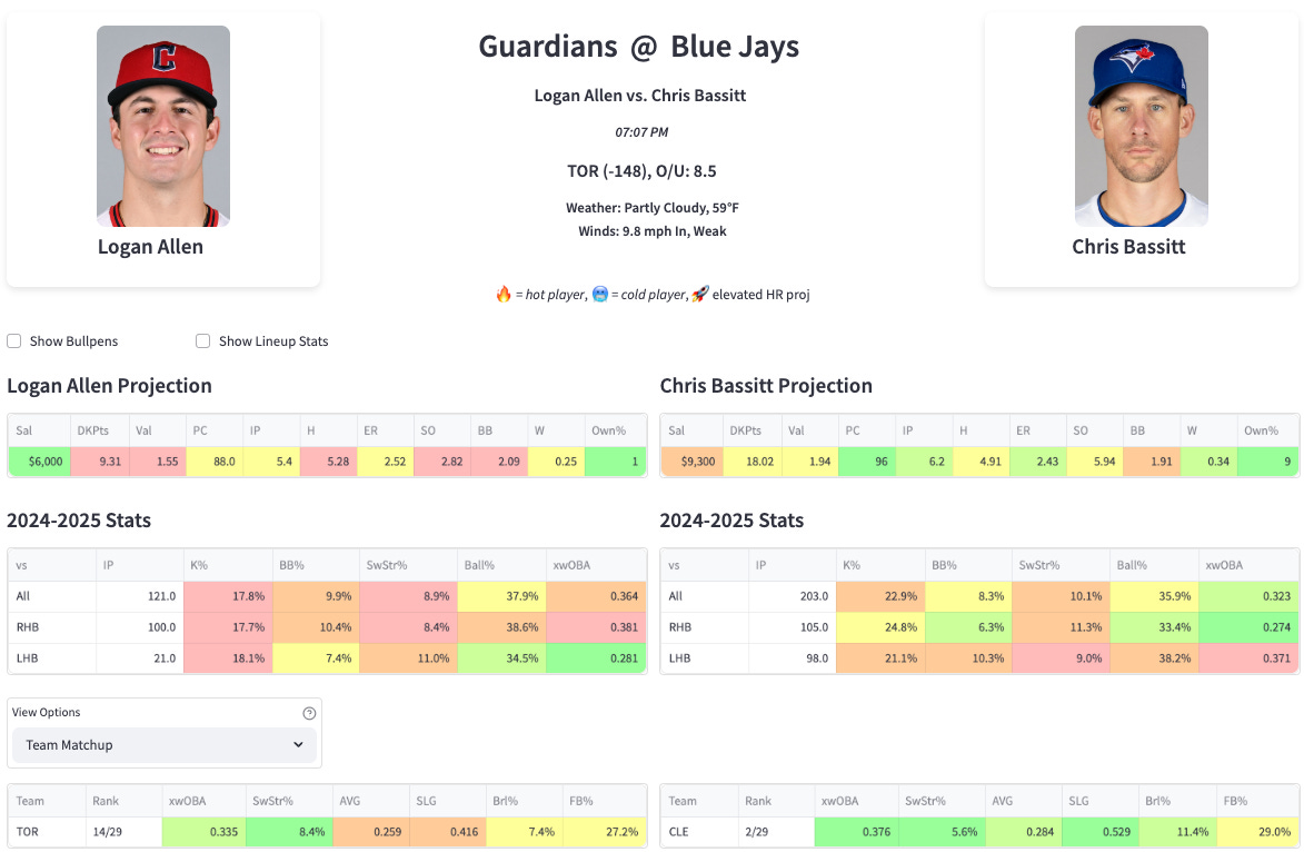 As for Chris Bassitt, I’m just not going to pay this kind of price ($9,300) for him. The K% is up to 27% for the year which has gotten his K-BB% into elite territory. And while the Guardians aren’t a hugely threatening offense, their team aggregated SwStr% in this matchup is 5.6%!