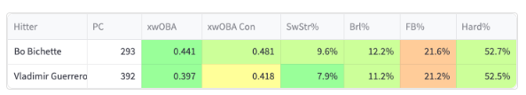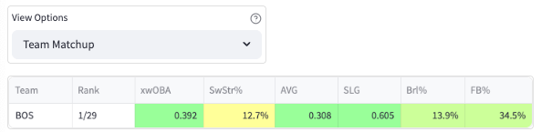You’ll see the 18% K% for Allen there with the .364 xwOBA allowed since last year. He’s one of the more hittable pitchers in the league. That pushes the Blue Jays lineup rank into the top half of the slate tonight (14/29). The best matchups are unsurprising: