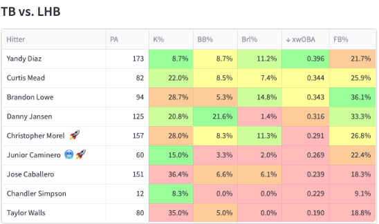As for the spot for Max Fried, I think it’s pretty great. Only Yandy Diaz has a high xwOBA against lefties in this Rays lineup, and we know that he has all kinds of trouble lifting the ball (22%).