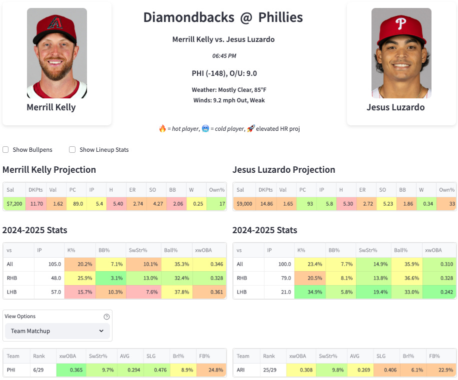 This one is not on the DFS slate either, so I have less to say about it. But this is a good spot for Jesus Luzardo. The D’Backs profile better against righties than lefties. It’s not that they can’t hit the ball against southpaws, but their power is really zapped.