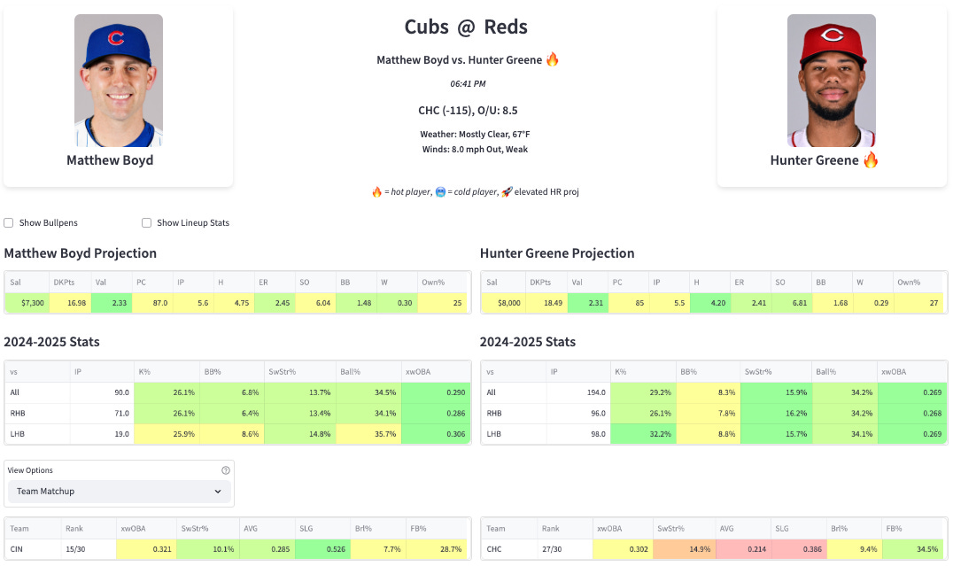 Great American Ballpark is always a bit scary for a fly-ball pitcher, and both of these guys are fly-ball pitchers. The wind is blowing slightly out here as well, so we could see some dingers. The Cubs will be a big challenge for Hunter Greene, but I doubt he will have much trouble. Greene has some of the best stuff in the league, and at the end of the day, that kind of pitching will beat hitters more often than not.