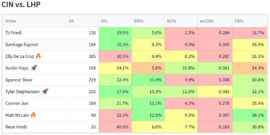 Elly De La Cruz does not hit for power against lefties. His xwOBA vs. LHP is .287 over the last two years. He’s still a threat to get on base and create havoc on the bags, but the power potential is much reduced here.