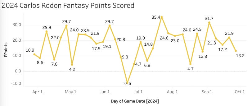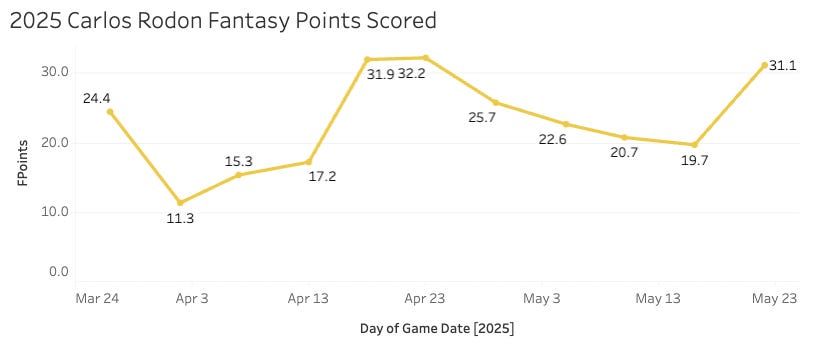 But I’ve gotta stop it there. I can’t get into this game of looking at a line and trying to guess the next point. Let’s lean on the projections here. Rodon leads the slate in projection (24.2 points, 1.8 above Joe Ryan, who is second), and he’s the #4 value on the board