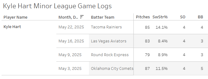 Hart made five starts in the Majors before getting demoted. In those starts, he posted a poo 17.8% K%, and even worse 8.2% SwStr%. Then he went to AAA and continued to struggle with the strikeout.