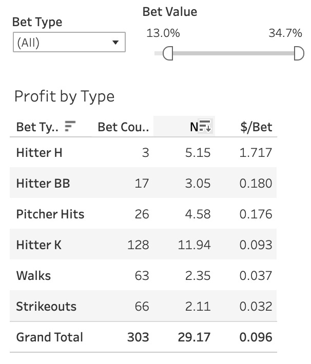 I’ve also refined the “Recommended Bets” to require different thresholds for each bet type in order to actually recommend the bet. For example, the pitcher walks and pitcher hits props haven’t been profitable until we get to at least a value of 0.13, so it will take at least that value to recommend a bet of those types. Hitter hits, hitter strikeouts and pitcher strikeouts have been profitable even between 0.10 and 0.12, so anything over 0.10 will qualify there. And so on and so forth.