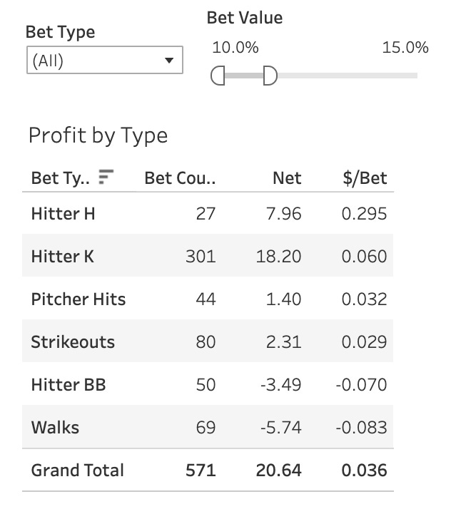 Before we were only tracking bets above 0.15, so this filter shows all of the bets that we are newly including today. You can see that hitter walks and pitcher walks have been losers at that value range, so you might want to avoid those lines unless they get to 0.15.
