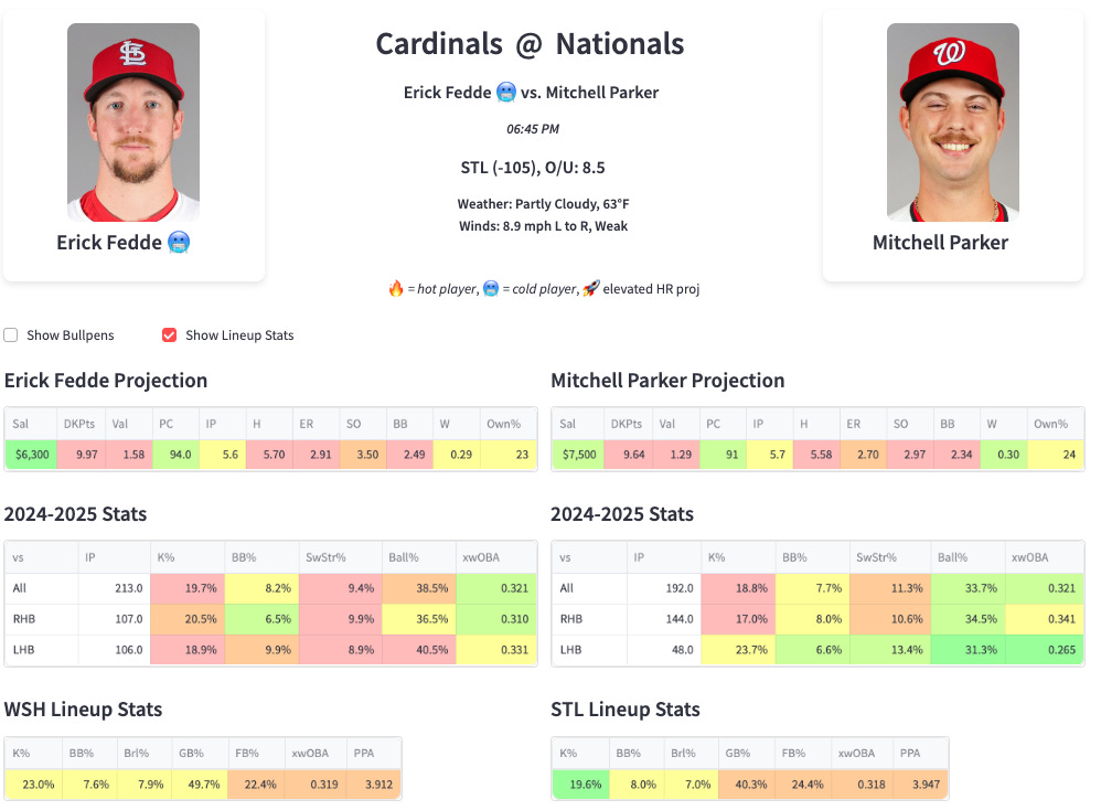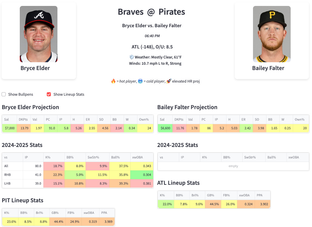 Something is wrong with Falter’s stats not showing there, but I’m just going to move past it. This is another one not on the DFS slate. We have two bad pitchers here, but the overall advantage goes firmly to the Braves.
