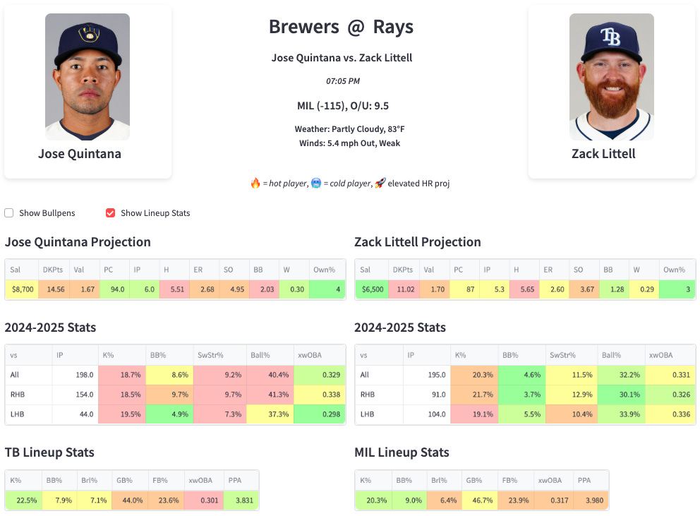 The model does recommend Jose Quintana Over 4.5 K (+125). The Rays have two super heavy K% hitters (Caballero 36%, Walls 32% against LHP), and then they also still have Morel (29%) and Lowe (28%) in there. There’s a lot of K opportunity for Quintana. That doesn’t make me want to use him at that price in DFS, but maybe that prop is a good idea.
