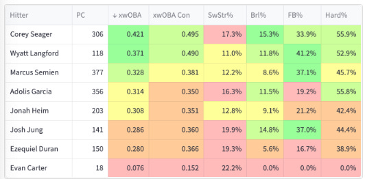 You can see the insane .216 xwOBA allowed to lefties since last year. He is nearly untouchable in those matchups. And righties don’t fare better at a .271 xwOBA. I would say there are only two truly good hitters in this Rangers lineup, Seager and Langford. And that shows up a bit on the advanced matchups results: